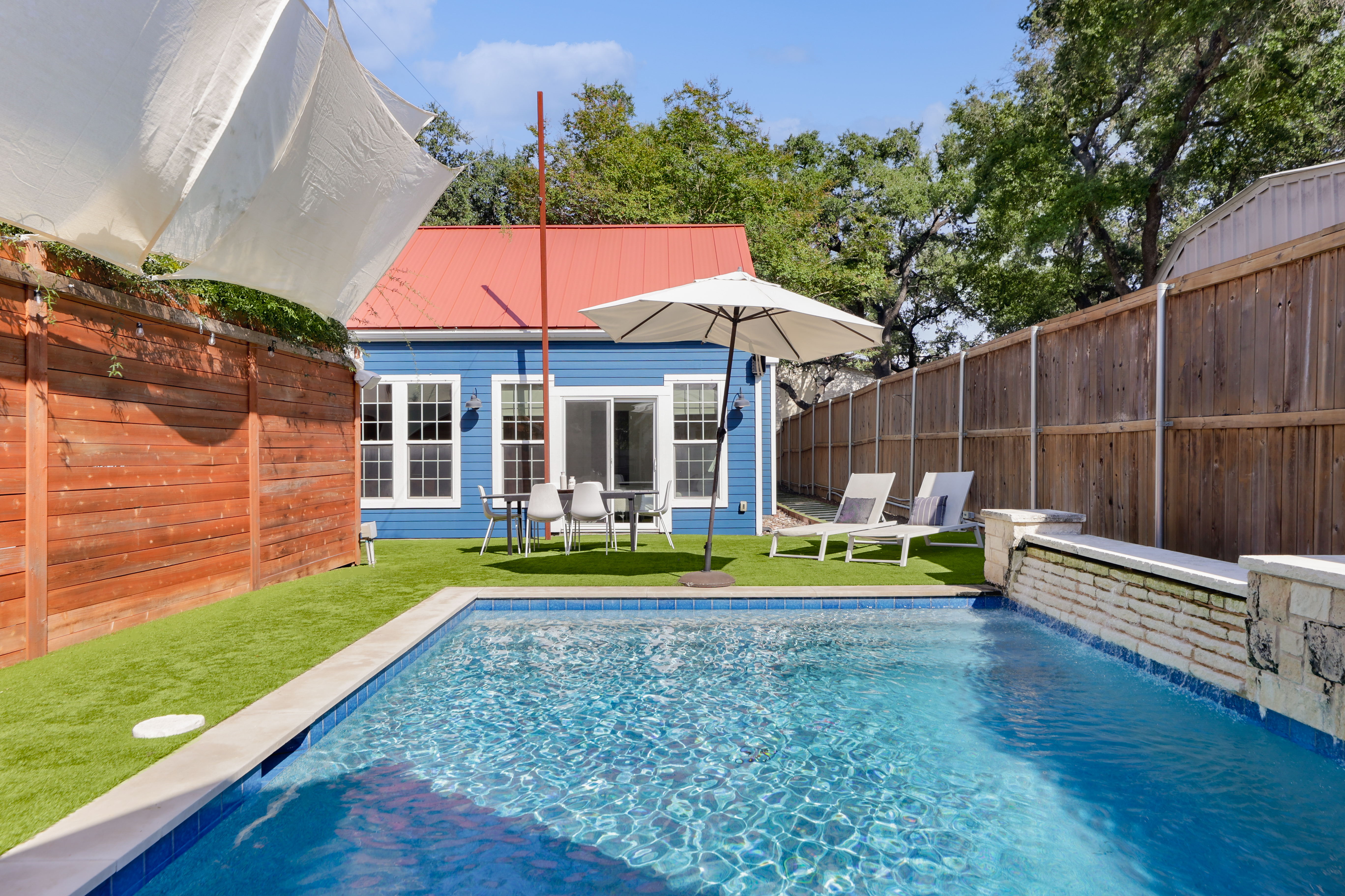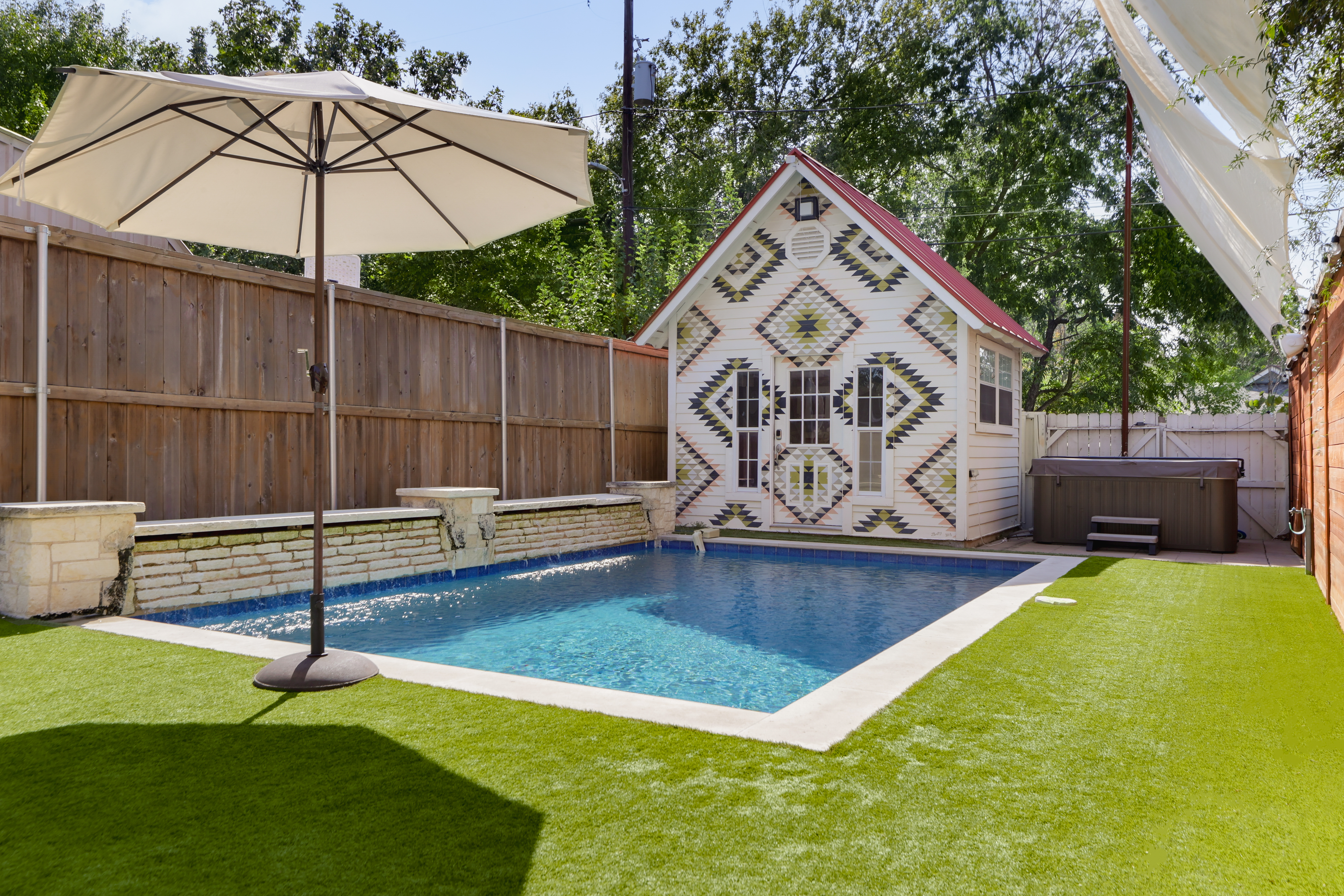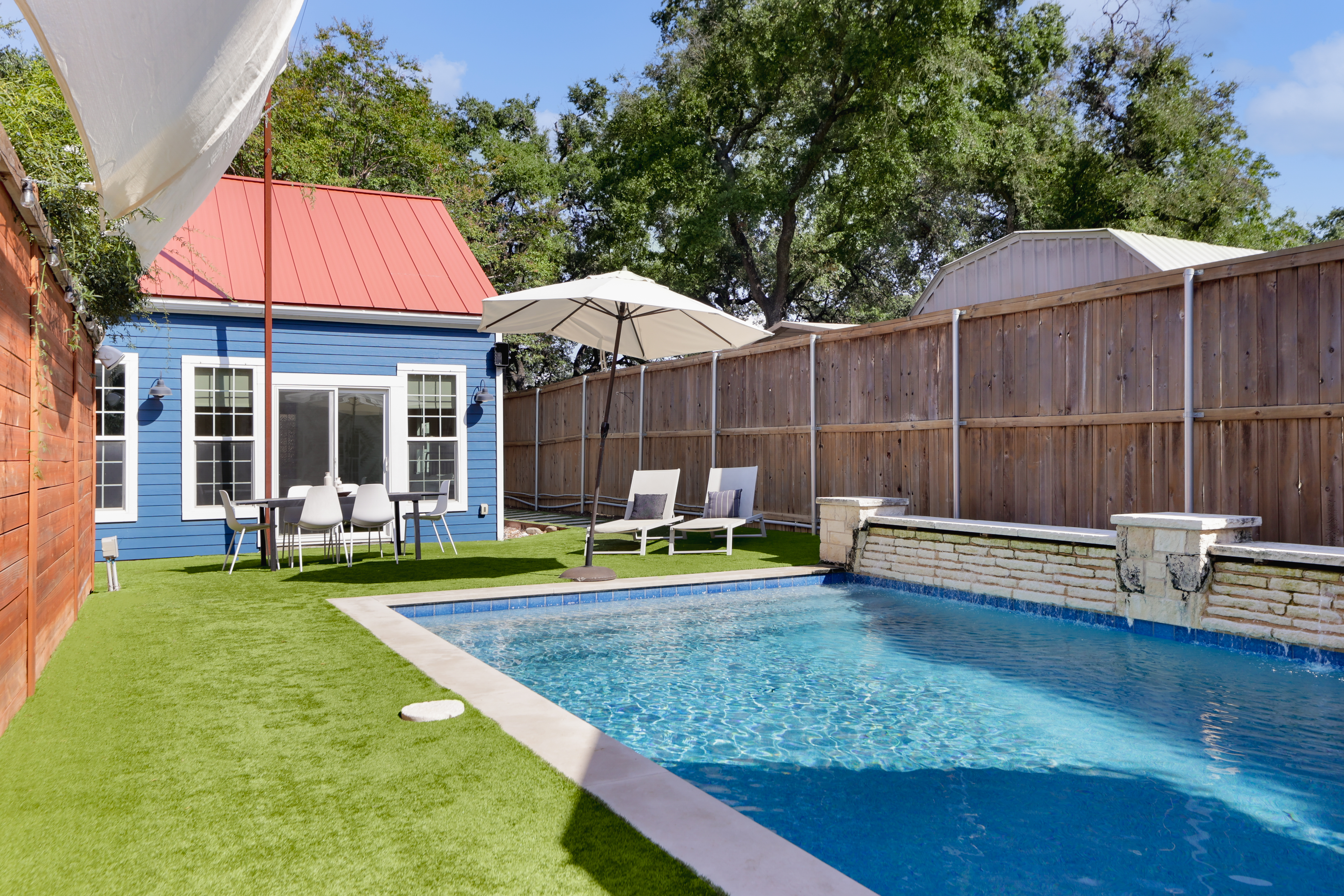 The outdoor oasis features a covered porch, turfed yard with lawn games, fire pit, stunning pool, spa, and grill area. This one-of-a-kind opportunity is fully furnished and move in ready! Embrace the Austin lifestyle in this enchanting cottage.
