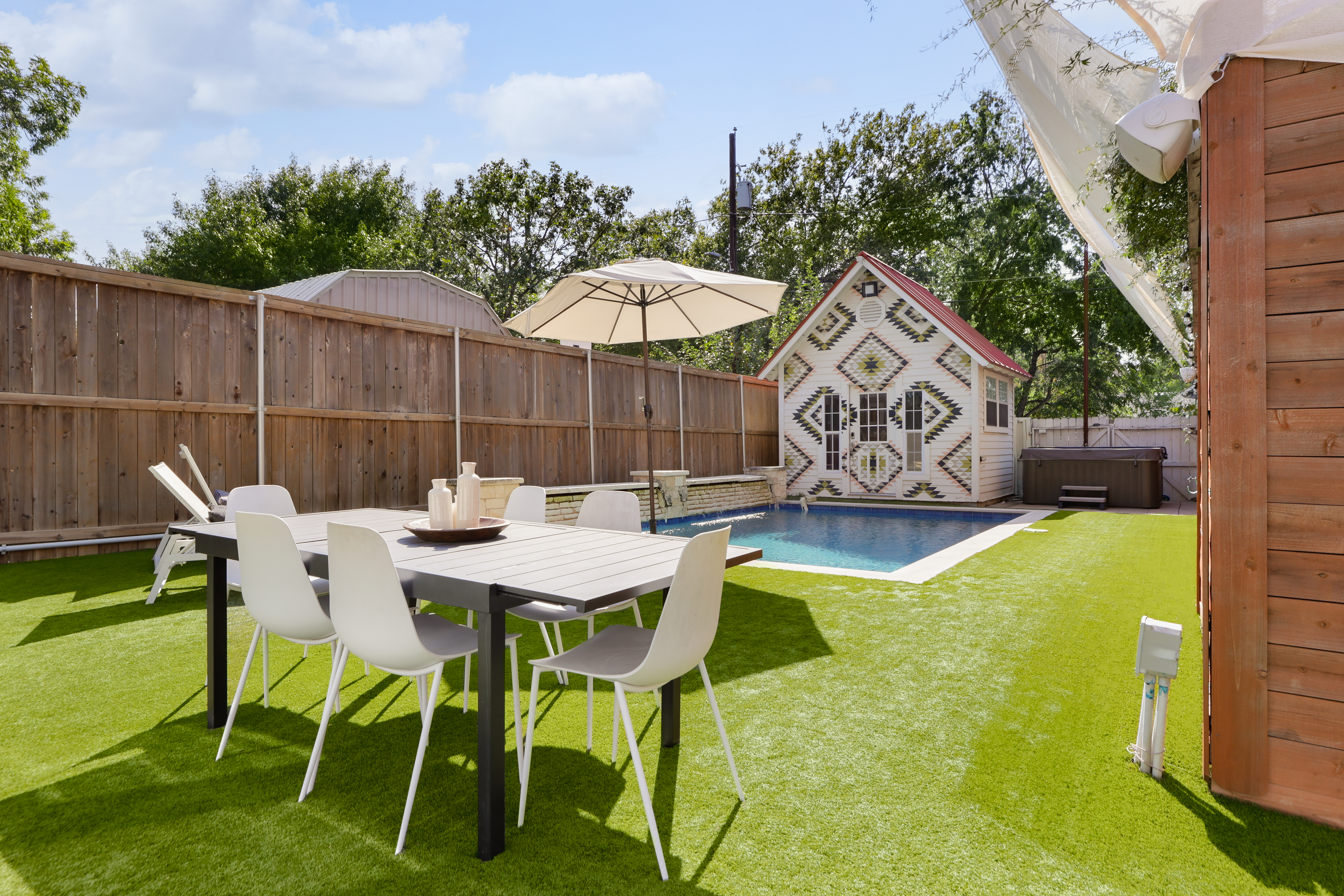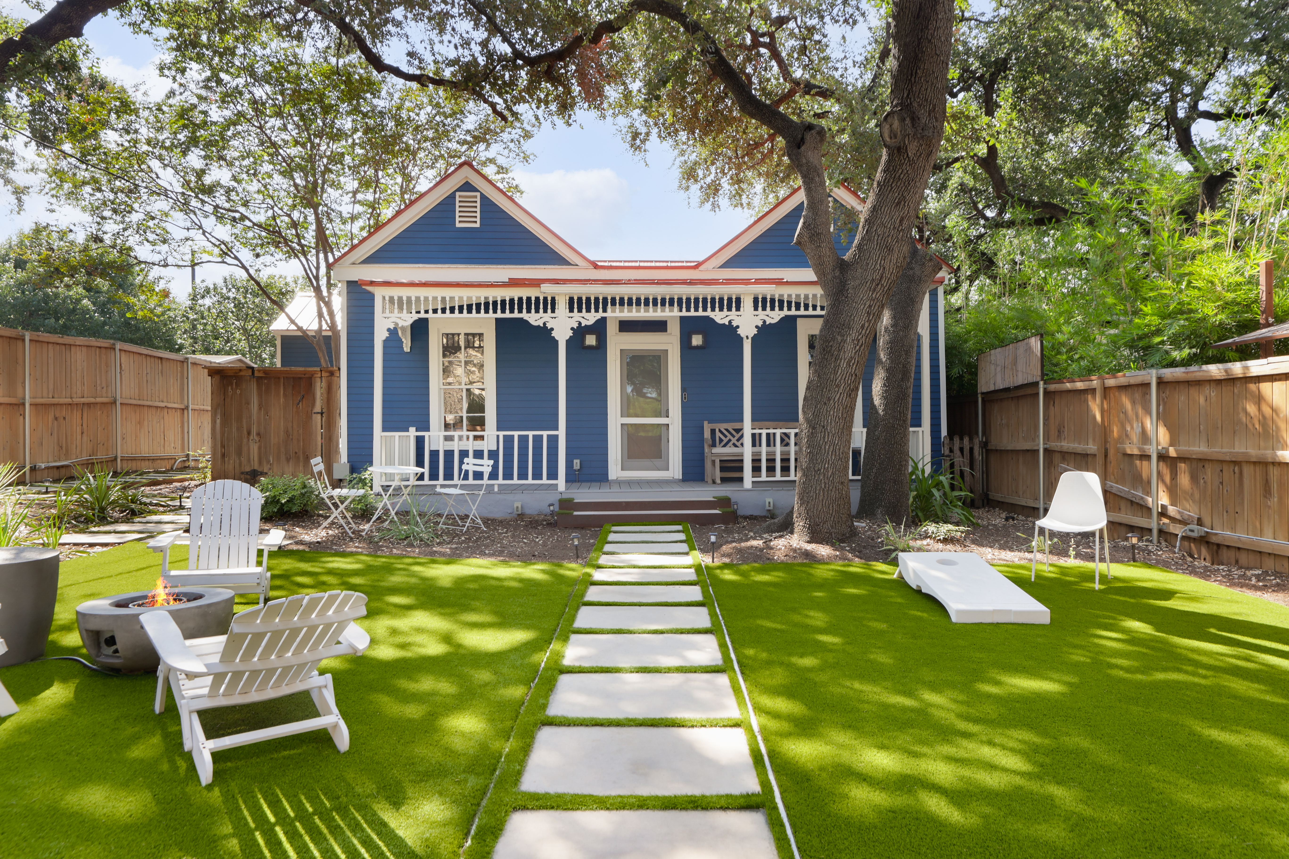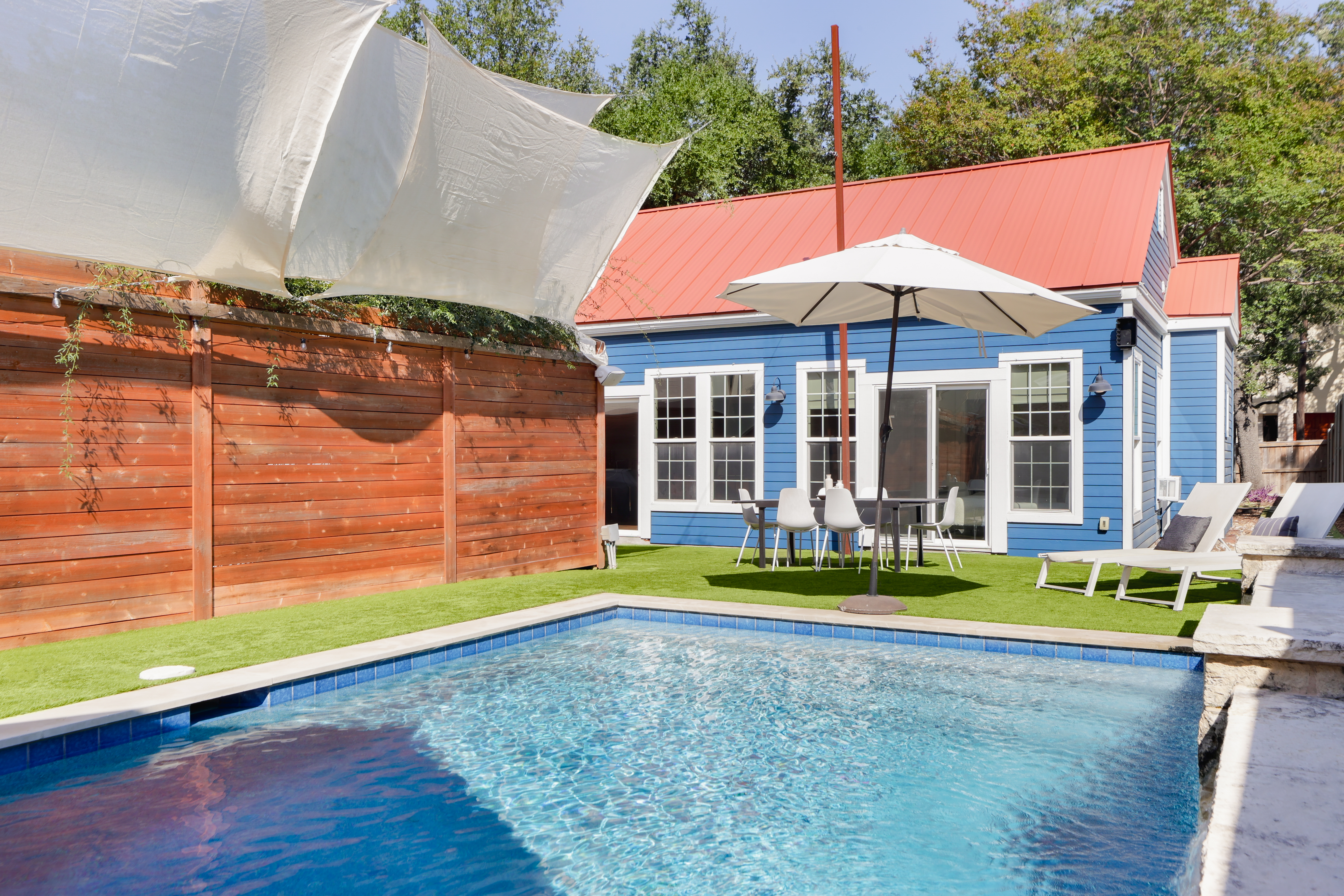 The outdoor oasis features a covered porch, turfed yard with lawn games, fire pit, stunning pool, spa, and grill area. This one-of-a-kind opportunity is fully furnished and move in ready! Embrace the Austin lifestyle in this enchanting cottage.